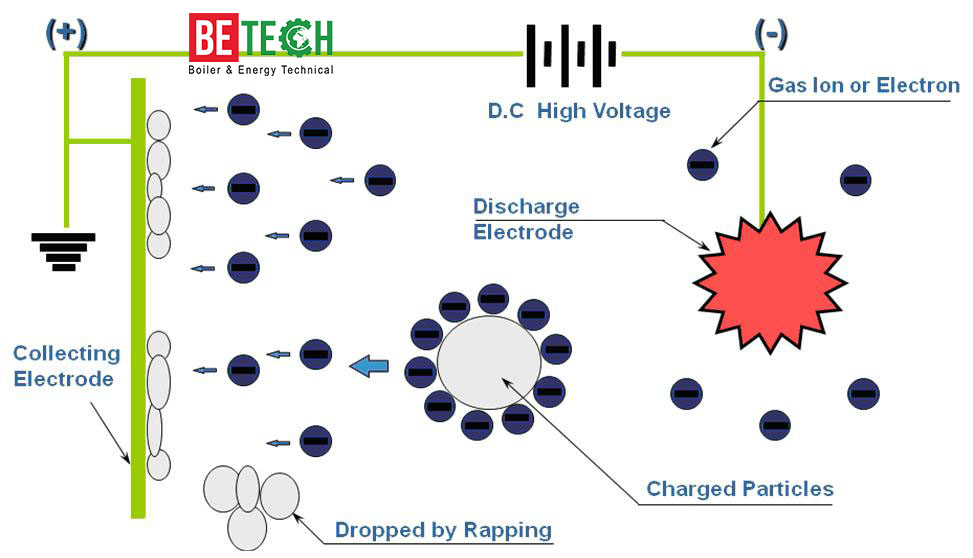 Bộ Lọc bụi tĩnh điện (ESP) là thiết bị lọc bụi bằng phương pháp tĩnh điện. Nguyên lý của ESP là: Khi dòng khói đi qua điện trường (được tạo bởi dòng điện một chiều có hiệu điện thế cao) dòng khói sẽ bị điện li tạo thành các điện tử, các ion âm và các ion dương. Bụi trong khói khi đi qua điện trường cũng bị nhiễm điện, các hạt bụi nhiễm điện sẽ bị hút về phía các điện cực trái dấu và bám trên bề mặt các điện cực. Sau một thời gian bụi bám trên bề mặt điện cực sẽ có chiều dày nhất định thì sẽ được hệ thống búa gõ, máy rung tách các hạt bụi và đưa về phễu thu hồi.
